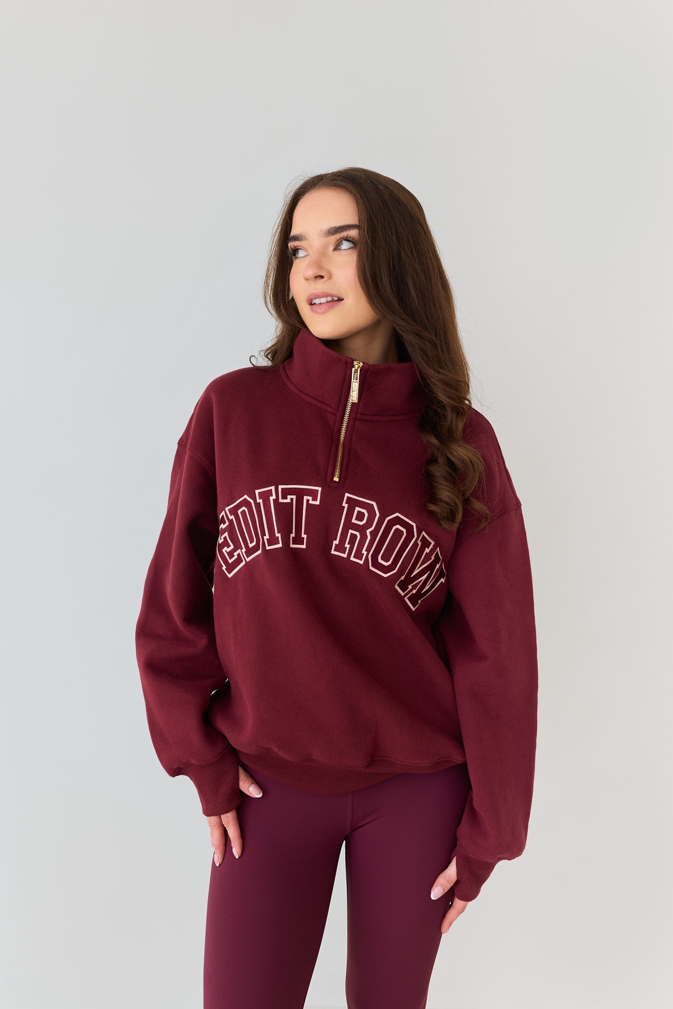 Claudia Half-Zip offers a sleek, hip-length fit. For an oversized look, size up, or stick to your usual size for a more fitted style.The model above is wearing a small. These are a small fit than varsity’s
